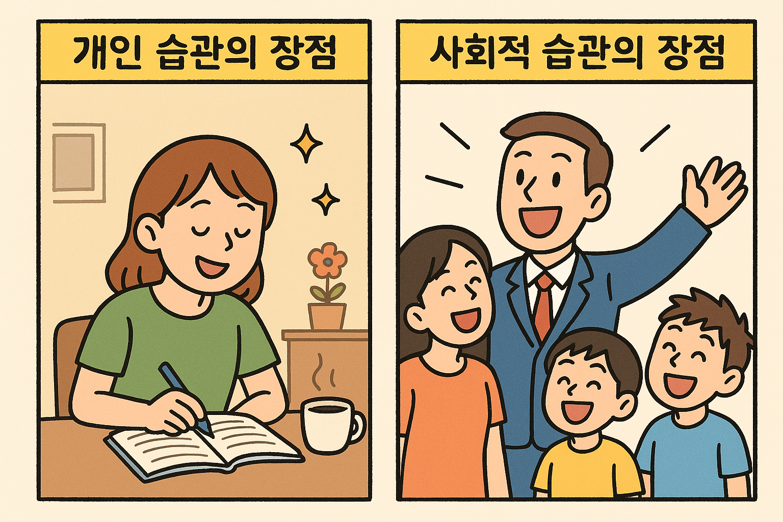 개인 습관은 자기 성장과 효율성의 기반이 되고, 사회적 습관은 관계 강화와 지속성을 이끌어냅니다. 두 가지 습관은 서로 보완 관계에 있으며, 균형 있게 실천할 때 삶의 질을 한 단계 높일 수 있습니다. 지금부터는 개인 습관과 사회적 습관을 함께 설계하여 성장과 행복을 동시에 추구해 보세요.